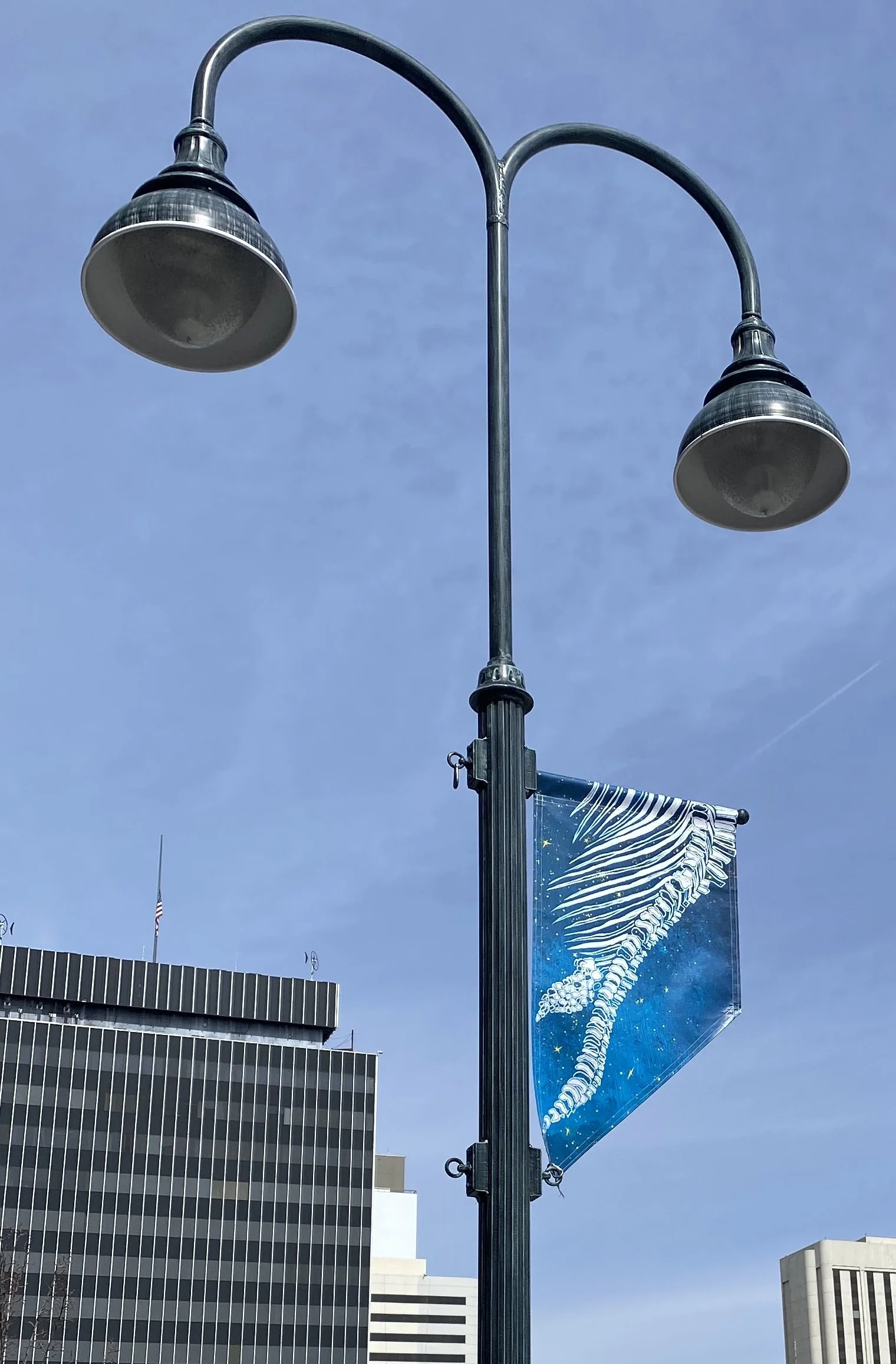 Ichthyosaur Sun, Silver Moon, Battle Born Rising · series of 6 ultraflex blackout banners installed in Aerial Gallery throughout Downtown Reno and Brewery District · 20 x 78” · 2023 – 2025